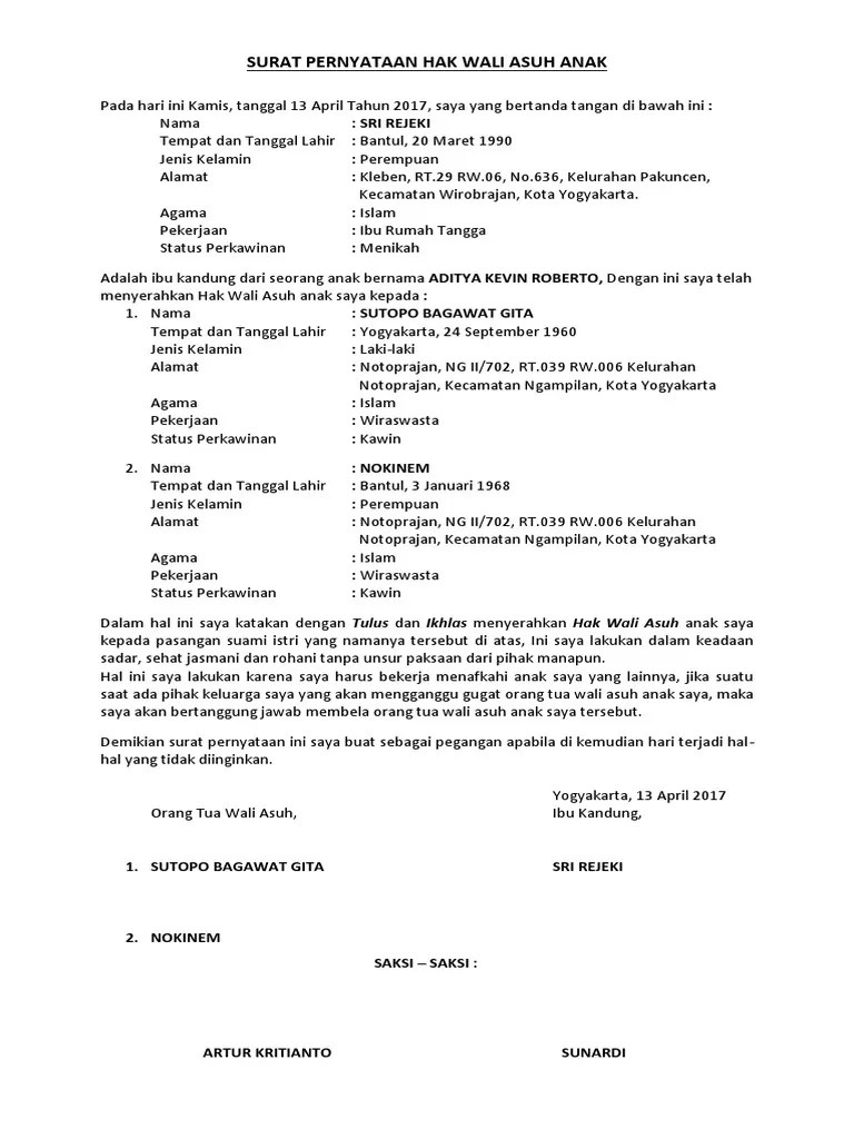 Surat pernyataan penyerahan anak ini diberikan dari pihak orang tua kandung kepada pihak orang tua asuh. Surat pernyataan penyerahan anak ini diberikan dari pihak orang tua kandung kepada pihak orang tua asuh. Surat ini digunakan untuk mengikat kedua belah pihak. Permohonan untuk mendapatkan izin mengangkat anak yang kami asuh, . Kesepakatan hak asuh anak ini dibuat dan ditandatangani pada hari ini rabu, tanggal 8 (delapan), bulan februari, .